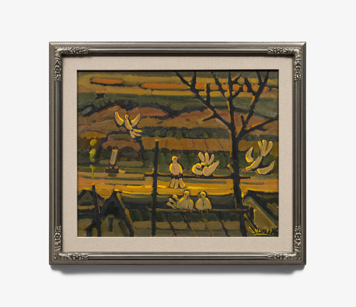 윤중식 ‘고향’(1979). 현대화랑 6.25 전쟁,유신 체제 등 엄혹한 시기 가운데서도 아픔을 딛고 예술 활동을 이어갔던 한국의 근현대 화가들 작품이 한자리에 모였다. 남북 분단 이후 고향인 평양에 돌아갈 수 없게 된 윤중식(1913~2012)과 박고석(1917~2002)은 아련한 풍경화를 통해 고향에 대한 애틋한 향수를 화폭에 담곤 했다. 주로 꽃과 여인을 대상 삼아 인물화·정물화를 그렸던 임직순(1921~1996)은 화면을 통해 보이지 않는 내면 세계를 드러내고자 노력했다. 홍익대 미대 초대 학장을 지낸 이대원(1921~2005)은 산과 들판 등 주변의 친숙한 풍경을 따뜻하게 그려냈다.