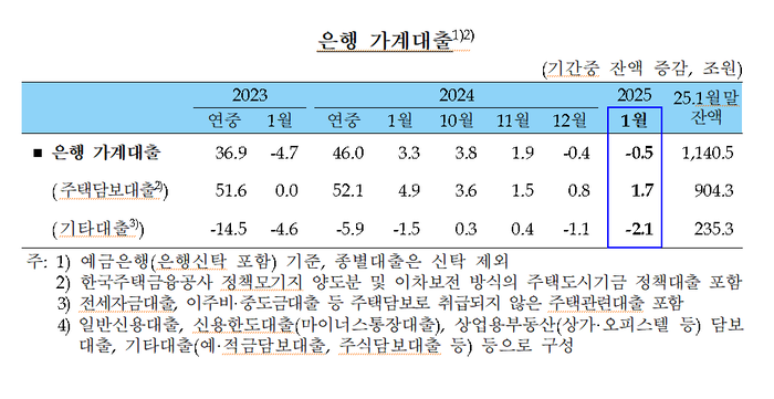 12일 한국은행이 발표한 ‘2025년 1월중 금융시장 동향에’ 따르면 지난달 은행권 가계대출은 1140조5000억원으로,전월대비 5000억원 감소한 것으로 집계됐다.