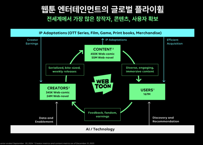 네이버웹툰의 플라이휠 전략 [출처 = 네이버웹툰] 간담회 동안 김 대표가 지속적으로 강조한 것은 창작자 생태계를 기반으로 다양한 콘텐츠가 만들어지고,콘텐츠가 새롭게 이용자를 유입시키는 네이버웹툰만의 ‘플라이휠’이다.