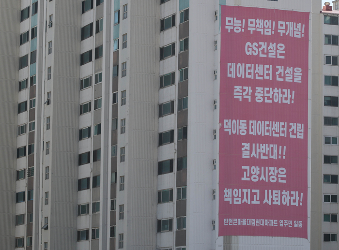 24일 경기 고양시 일산서구 덕이동 아파트 외벽에는 데이터센터를 반대하는 펼침막이 1년 넘게 붙어 있었다. ‘GS건설은 데이터센터 건설을 즉각 중단하라’ ‘고양시장은 책임지고 사퇴하라’ 등 분노에 찬 문구가 빼곡했다. 이 아파트 인근에 건설 예정인 데이터센터에 대한 성토다.
