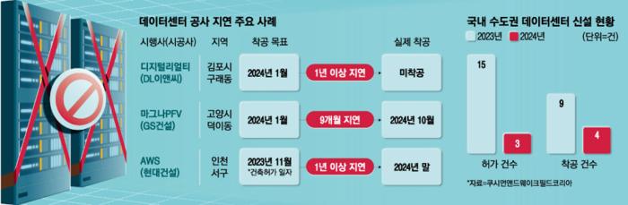 세빌스코리아에 따르면 작년 상반기 기준 수도권에서 데이터센터 용도로 인허가를 받은 총 33건 사업 중 절반 이상인 17곳이 사업 진행에 어려움을 겪거나 지연됐다. 인허가를 받은 사업 중 35%가 1년 이상 착공하지 못했고,공사를 진행 중인 사업 중 약 30%는 인허가 후 착공까지 1년 이상 소요됐다. 세빌스는 과거 4년간 개발된 데이터센터들이 인허가 후 평균 4~5개월 내 착공했던 것과 비교하면 다수 사업이 계획했던 일정 대비 지연되고 있다고 분석했다.