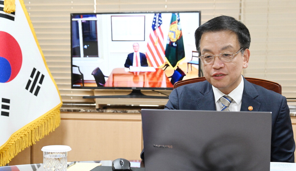 최상목 대통령 권한대행 부총리 겸 기획재정부 장관이 28일 오전 정부서울청사에서 스콧 베선트 미국 재무장관과 영상 면담을 하고 "상호관세 등 미국 정책을 결정하는 과정에서 한국의 기여를 고려해달라"고 당부했다.