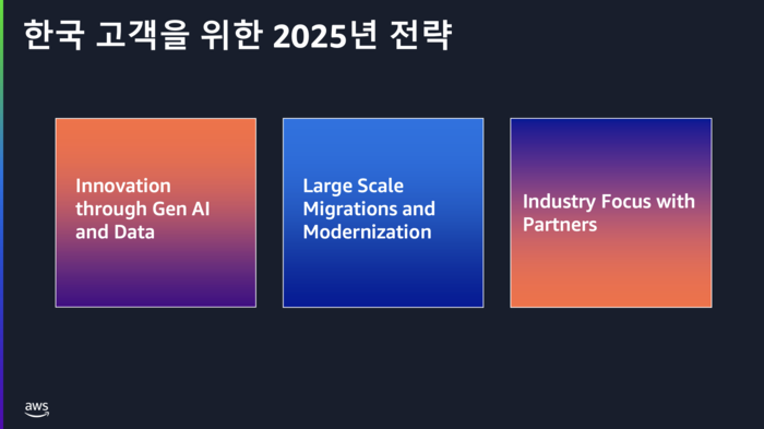 [자료 제공 = AWS] 함 대표는 올해 사업 전략을 ▲생성형 AI와 데이터를 통한 혁신 ▲대규모 이전(마이그레이션) 및 현대화(모더나이제이션) ▲산업 특화된 파트너십의 3가지로 제시했다.