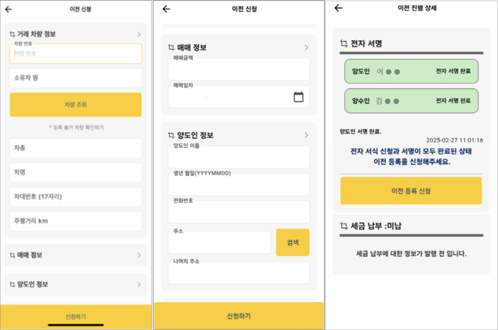 개인 간 직거래 등록도 ‘무료’ 제공 이번 개인 간 자동차 이전등록 서비스는 단독 이용도 가능하며,이 경우에도 무료 제공된다. 즉,중고차 직거래를 원하는 매매자들은 복잡한 절차 없이 무료로 자동차 이전등록을 진행할 수 있다.