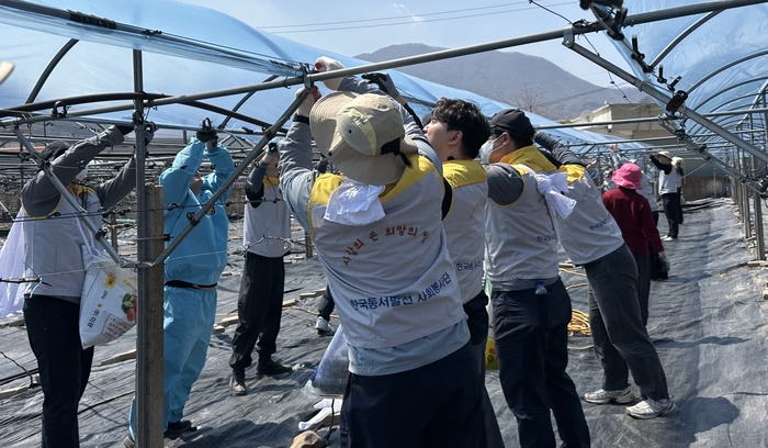 8일 동서발전에 따르면 사회봉사단 100여명이 지난 7일부터 오는 9일까지 경북 영덕군을 찾아 산불 피해 농가의 비닐하우스 철거·복구를 돕는 등 다양한 봉사활동을 펼치고 있다.