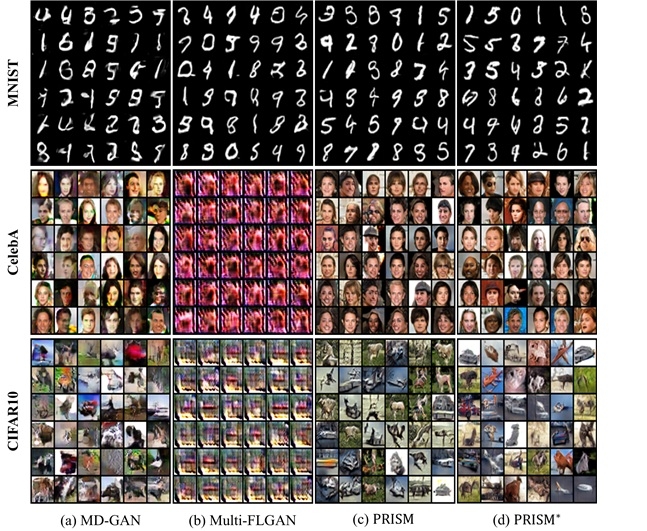 데이터셋을 이용한 생성형 이미지 비교. 각 행은 순서대로 MNIST,FMNIST,CelebA 데이터셋을 이용한 생성 이미지를 나타낸다. 기존 방식보다 유니스트 연구팀이 개발한 PRISM(맨 오른쪽)이 더 자연스럽고 품질 높은 이미지를 생성함을 확인할 수 있다. [유니스트]