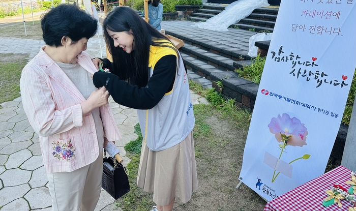 동서발전 직원이 어르신에게 카네이션을 달아드리고 있다. [사진 = 한국동서발전] 한국동서발전은 가정의 달을 맞아 7일 울산 중구 함월노인복지관에서 ‘함월 효(孝)축제 어버이날 행사’에 참여했다고 밝혔다.