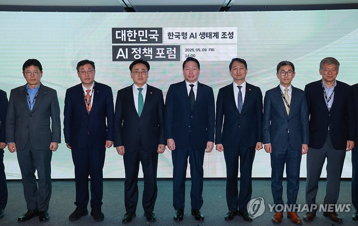 유상임 장관(왼쪽 세번째)은 9일 대한민국AI정책포럼에 참석해 최태원 SK그룹 회장(왼쪽 네번째)과 만났다. 연합뉴스