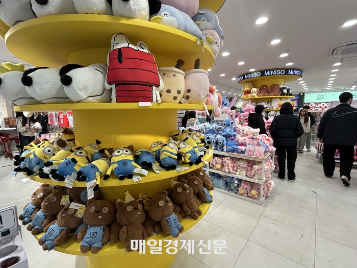 지난 22일 방문한 서울 종로구 혜화역 인근 미니소. 매장 입구에서부터 스누피,미니언즈,스티치 등 다양한 캐릭터 인형들이 반겼다. [변덕호 기자] 앞서 또 다른 중국판 다이소인 ‘미니소’(MINISO)가 국내 시장에 발을 내딛은 바 있다.