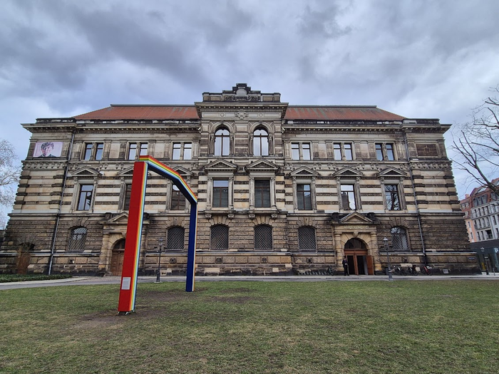 거대한 현대미술관 알버티눔 우측의 모습. 공원에는 설치된 마렉 솝치크의 직사각형 무지개 형태의 문 조각,[예술가의 예우]. 미술관의 포용성을 상징하며 2024년 설치됐다. ©김슬기