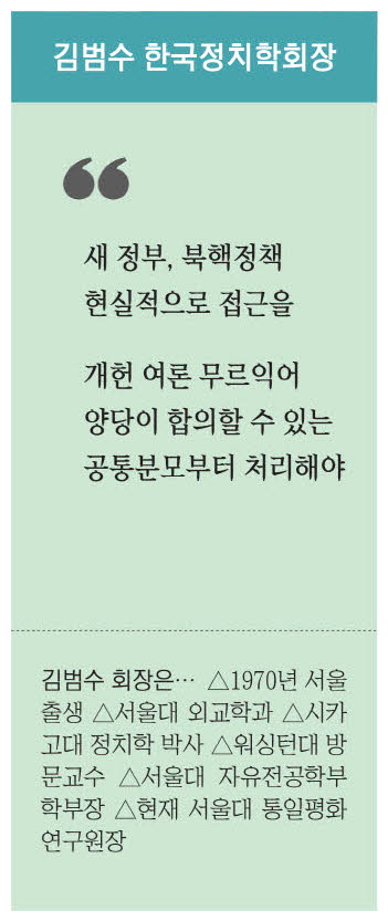 ▷김 회장=이게 뭔가 역린을 건드리는 것 같아서 굉장히 조심스럽지만,새 정부는 북핵 정책을 좀 더 현실적으로 바라보고 접근해야 할 것 같다. 우리는 지금 북한을 핵 보유국으로 인정하지 않고 있다. 그런데 솔직히 북한이 핵무기를 갖고 있는 것은 다 알고 있지 않나. 강의할 때 학생들에게 북한이 핵을 갖고 있다고 생각하느냐고 물으면 거의 모두가 그렇다고 한다. 북한은 헌법에 핵 보유를 명기했고,김정은 국무위원장도 수차례 핵을 포기하는 일은 없을 것이라고 선언했다. 그런데 우리가 북한을 핵 보유국으로 도저히 인정하지 못하다 보니 대북 정책이 한 발도 못 나가고 있다. 북한이 사실상 핵무기를 갖고 있다고 인식하면서도 이를 인정하지 않으니 현실과 동떨어진 비핵화 정책에만 매달리는 것이다. 우리는 북한의 핵 보유를 인정하지 않지만,도널드 트럼프 미국 대통령도 몇 차례 북한이 핵을 가졌다고 언급한 적이 있다. 그렇다면 북핵 정책을 이원화해서 장기적인 목표는 북한의 비핵화를 추구하되,단기적으로는 북한이 사실상 핵무기를 갖고 있다고 보고 정책을 마련하는 것이 이치에 맞지 않겠나 생각한다. 그래야 한중 관계,한·러 관계,한·미·일동맹 등에서 현실적인 정책을 펼칠 수 있다.