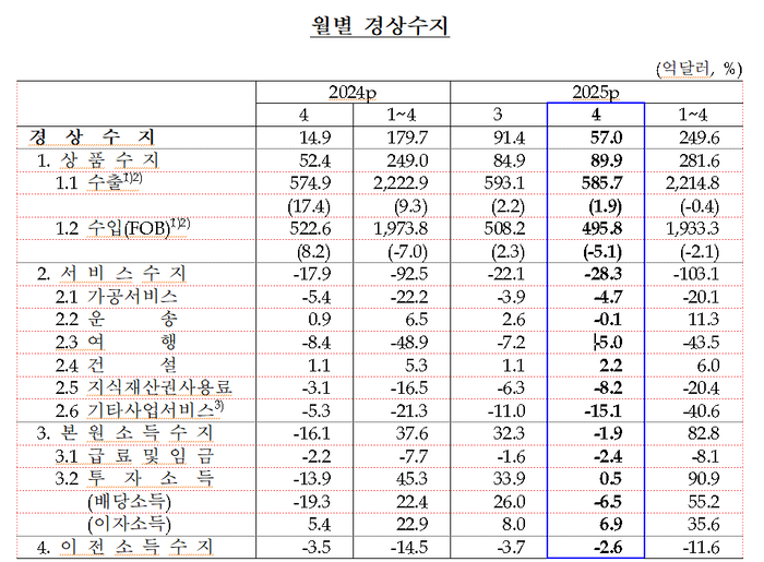 [속보] 4월 한국 경상수지 57억달러…24개월 연속 흑자