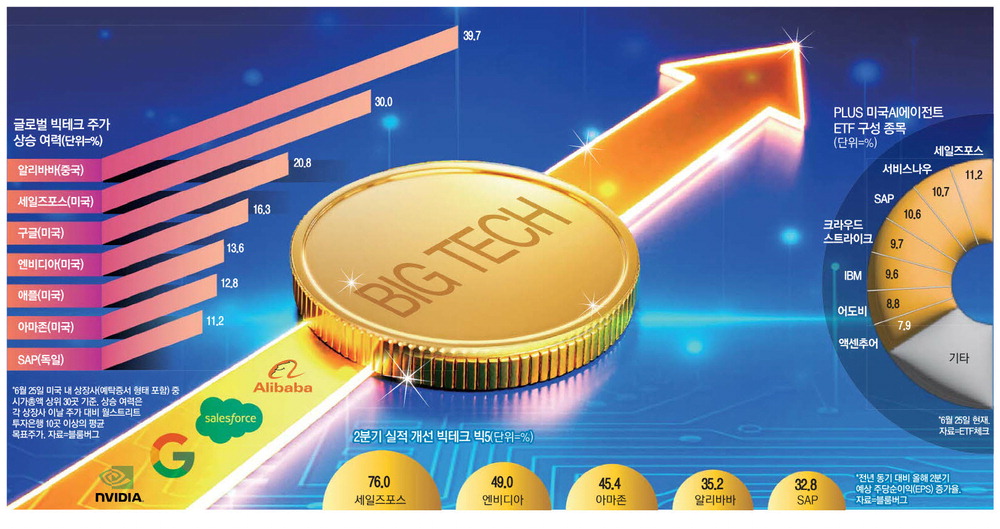 글로벌 빅테크에 분산 투자하려면 국내 상장 ETF가 대안이 된다. 마이크로소프트 AI 서비스 '코파일럿'에 물어보니 'PLUS 미국AI에이전트' ETF를 답으로 내놨다. 이날 현재 구성 종목으로 세일즈포스(11.2%) SAP(10.6%) 등을 비중 있게 담고 있다. 국내 상장 ETF이므로 연금저축펀드 등 절세 계좌에 투자할 수 있다.