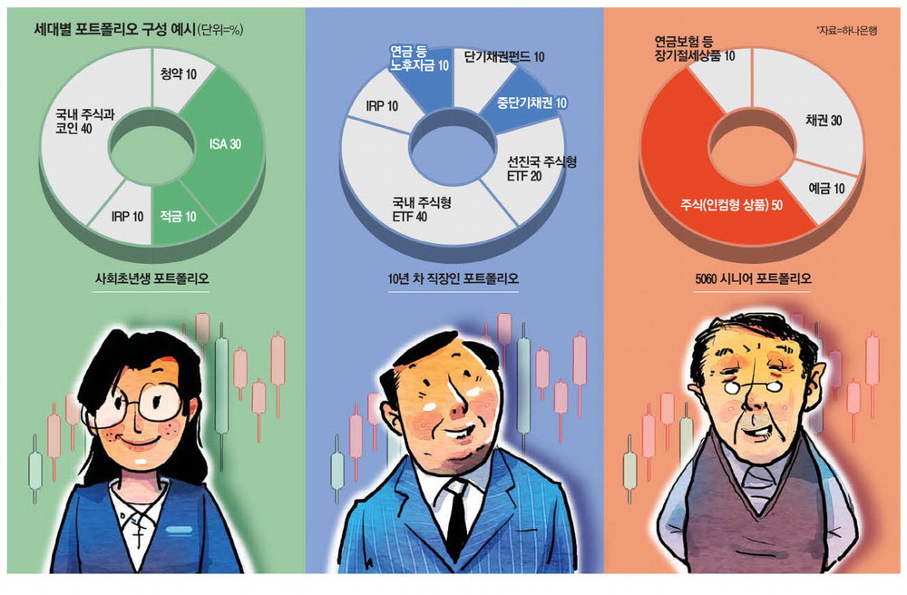 은퇴를 앞둔 5060세대의 경우는 자산의 대부분이 부동산에 집중된 경우가 많다. 이들은 다른 직장에 취업하거나 자영업을 시작해야 할 수도 있어 은퇴 후 퇴직금과 금융자산의 수익률에 민감할 수밖에 없다. 김 부장은 은퇴 이후 공적연금을 받기까지 현금흐름을 확보하는 것을 핵심으로 봤다. 주식은 성장주와 배당주를 적절히 배분해 은퇴 후 배당금을 통해 생활비에 활용할 수 있도록 고배당주 중심으로 투자할 것을 추천했다. 채권은 예금보다 높은 이자를 주는 이표채(일정 기간마다 이자를 지급하는 채권)에 투자할 것을 제안했다.