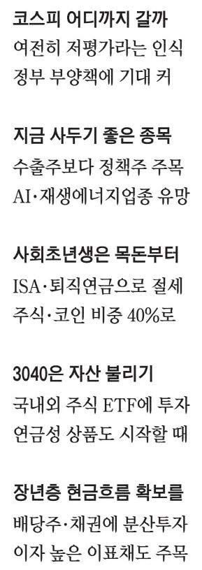 박석현 우리은행 WM솔루션부 부부장 겸 증권 애널리스트는 현 정부의 대표적인 경제와 금융시장 정책에 발맞출 수 있는 섹터를 찾아야 한다고 진단했다. 재정 역할 강화를 통한 성장 회복,상법 개정을 통한 주주권익 보호 강화,배당 확대 유도,에너지고속도로 정책 등이 해당한다. 박 애널리스트는 "대외 변수에 따른 주가 영향력이 큰 수출주보다는 대내 정책 변수 영향력이 큰 정책 테마를 살펴봐야 한다"며 "금융과 지주회사,태양광,풍력,전력 인프라 등에 관심을 가져볼 만하다"고 진단했다. 금 투자의 경우 은행 PB들은 최근 가격이 크게 상승한 만큼 많은 금액을 지금 한 번에 투자하기보다는 꾸준한 적립식 투자를 권했다.