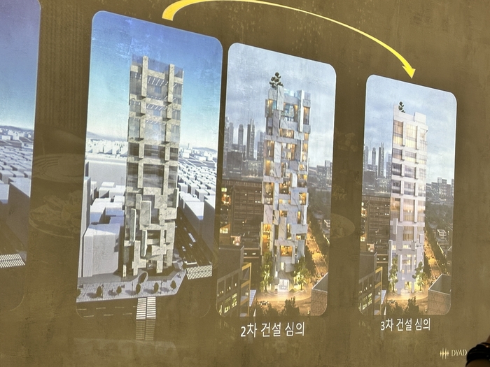 이날 디아드 측은 3차 건설심의를 마친 최종 설계안을 공개했다. 페로가 구상한 입체적인 디자인을 일부 손본 형태다. 경기 침체와 공사비,자재비 인상 등이 겹치면서 시행사와 시공사 협의를 거쳐 천연 대리석 등 외장재 일부를 뺐다. 디아드 측은 외장 자재를 이미 확보했다고 밝혔지만,보강 공사를 맡을 시공사는 아직 정해지지 않았다. 이달 안에 시공사를 확정하겠다는 계획이지만,이후에도 외관이 또 바뀔 수 있다는 여지는 남겨뒀다. 사실상 외관은 여전히 ‘진행 중’이다.