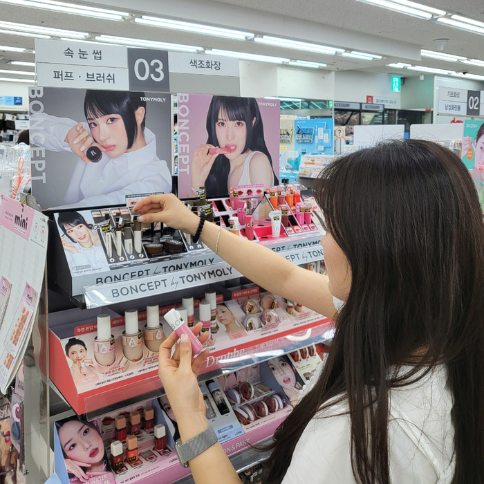 다이소 토니모리 본셉 매대에서 고객이 상품을 살펴보고 있다. 글로벌 뷰티 브랜드 토니모리의 서브 브랜드 ‘본셉’이 비타씨 및 색조 신제품 인기에 힘입어 다이소를 통해 누적 판매량 500만 개를 돌파했다고 4일 밝혔다.