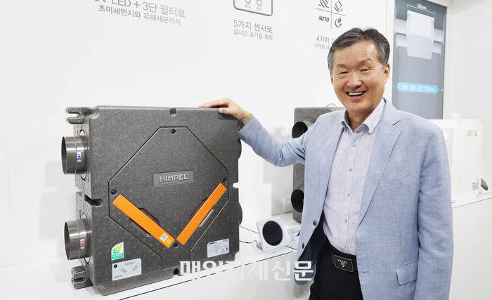 김정환 힘펠 대표가 힘펠의 대표 전열환기시스템 ‘휴벤’앞에서 포즈를 취했다. 전열환기시스템은 냉난방열을 회수해 탄소감축에도 도움을 주는 제품이다. [이충우기자] 지난 10일 찾은 경기도 화성시 힘펠 본사,김정환 대표의 사무실에는 공기청정기 대신 전열교환식 환기장치들이 줄지어 놓여 있었다. 에어컨 크기의 스탠딩형 환기장치 모니터에는 미세먼지(2㎍/㎥)와 초미세먼지(4㎍/㎥),이산화탄소 농도(781ppm) 숫자가 표시됐다.