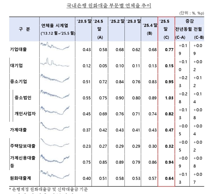 [자료 = 금감원] 부문별로는 기업대출 연체율은 0.77%로 전월대비 0.09%포인트 올랐다. 대기업대출 연체율이 0.15%로 0.02%포인트 상승했고,중소기업대출 연체율은 0.95%로 0.12%포인트 올랐다. 중소법인 연체율(1.03%)은 0.14%포인트,개인사업자대출 연체율(0.82%)은 0.08%포인트 증가했다.