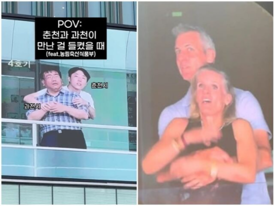춘천시가 과천시와 공동 유치한 푸드테크 선도도시 포럼을 홍보하기 위해 콜드플레이 공연에서 포착된 불륜 장면을 패러디했다. (사진=춘천시 인스타그램,틱톡) 춘천시는 지난 23일 공식 인스타그램 계정에 “춘천과 과천이 만난 걸 들켰을 때(feat. 농림축산식품부)”라는 제목의 짧은 영상을 게시했다. 이는 최근 콜드플레이 서울 콘서트에서 포착된 ‘불륜 스캔들’을 재치 있게 패러디한 것이다.