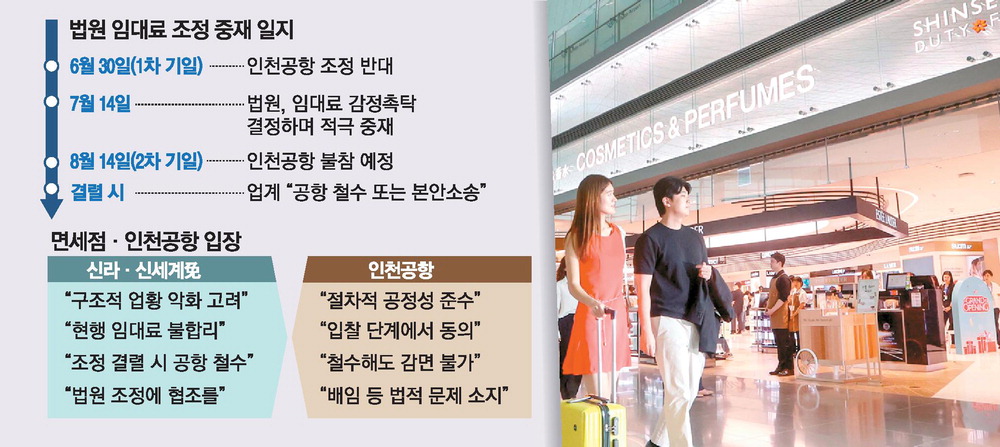 신라면세점과 신세계면세점 법률대리인은 31일 매일경제와 통화하면서 "양사가 계약한 인천공항 면세점 운영 기간이 앞으로 8년 남았지만,임차료로 막대한 적자를 보고 있기 때문에 현재 임차료 수준을 도저히 받아들일 수 없다"며 "조정이 결렬되면 이들 면세점은 인천공항에서 철수할 것"이라고 밝혔다.