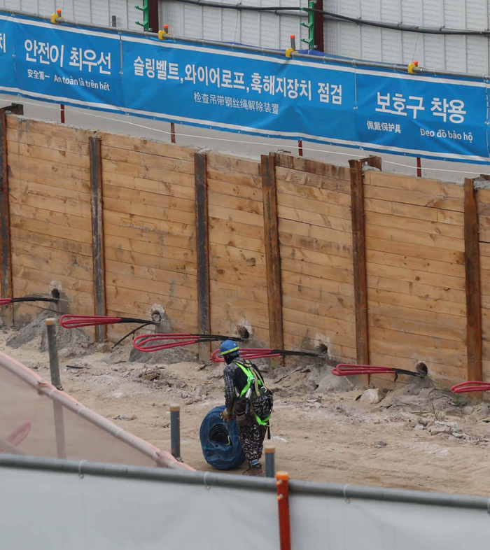 서울시내 한 아파트 공사현장에 중국어와 베트남어 등으로 안전 관련 문구가 적힌 플랜카드가 붙어 있다. [한주형 기자] 건설업계에 긴장감이 감돌고 있다. 노란봉투법(노동조합 및 노동관계조정법 2·3조 개정안)의 국회 통과를 앞두고 있기 때문이다.