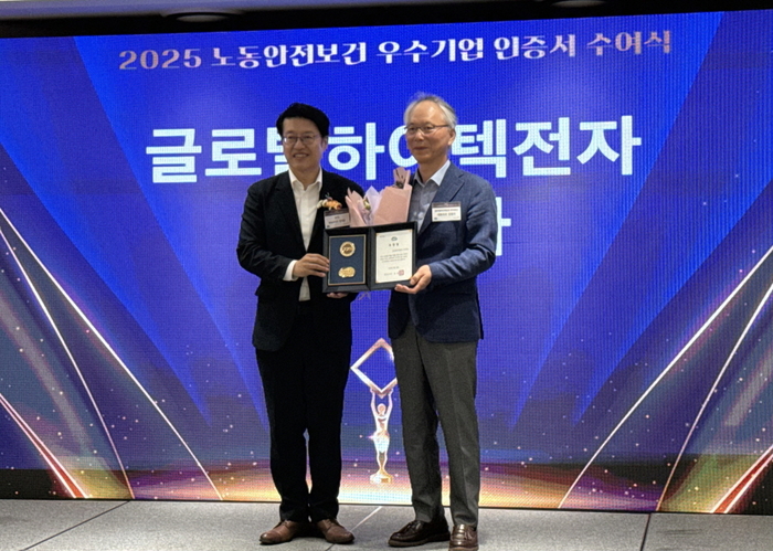 < 글로벌하이텍전자 오정기 대표(오른쪽)가 김대순 경기도 부지사로부터 경기도지사 표창을 받고 있다 / 사진 제공 : 하이텍그룹 > 글로벌하이텍전자 주식회사(대표 오정기)가 23일,수원 이비스 앰배서더호텔에서 열린 ‘2025년도 경기 노동안전보건 우수기업’ 시상식에서 대상을 수상했다고 밝혔다.