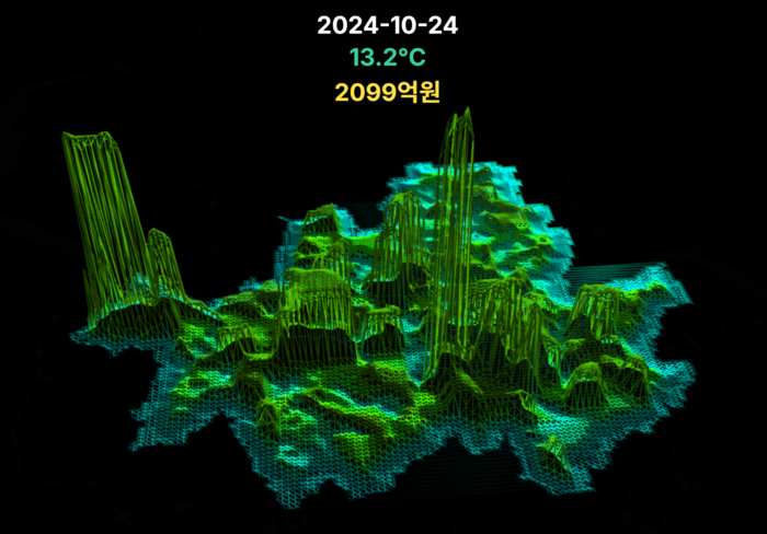 윤윤진 KAIST 건설및환경공학과 교수(도시인공지능연구소장)가 시각화한 서울 시내 지역별 소상공인 매출 데이터. 기온별로 매출이 어떻게 변하는지를 확인할 수 있다. [사진=KAIST] 서울 시내 위치한 편의점의 18%는 기후위기가 심해질수록 매출이 떨어지는 것으로 드러났다.