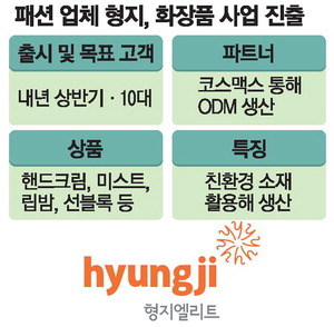 교복 제조 업체 형지엘리트가 내년 상반기 10대를 겨냥한 화장품을 내놓으며 패션에서 뷰티로 사업을 확장한다. 친환경 소재를 사용한 제품을 내놓을 예정이며,형지그룹 창업자인 최병오 회장의 장남인 최준호 형지엘리트 대표이사가 이번 사업을 진두지휘하고 있다. K뷰티가 미국,일본,동남아시아 등에서 큰 인기를 끌면서 화장품 사업 진출을 검토해오다가 10대를 대상으로 승부를 건 것으로 보인다.