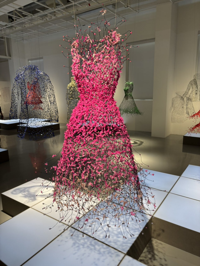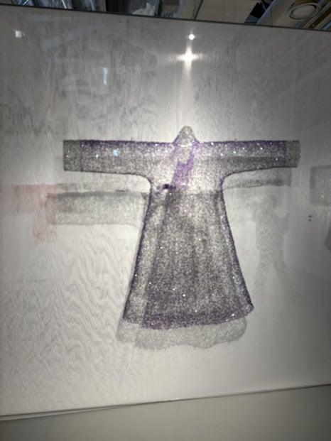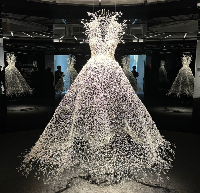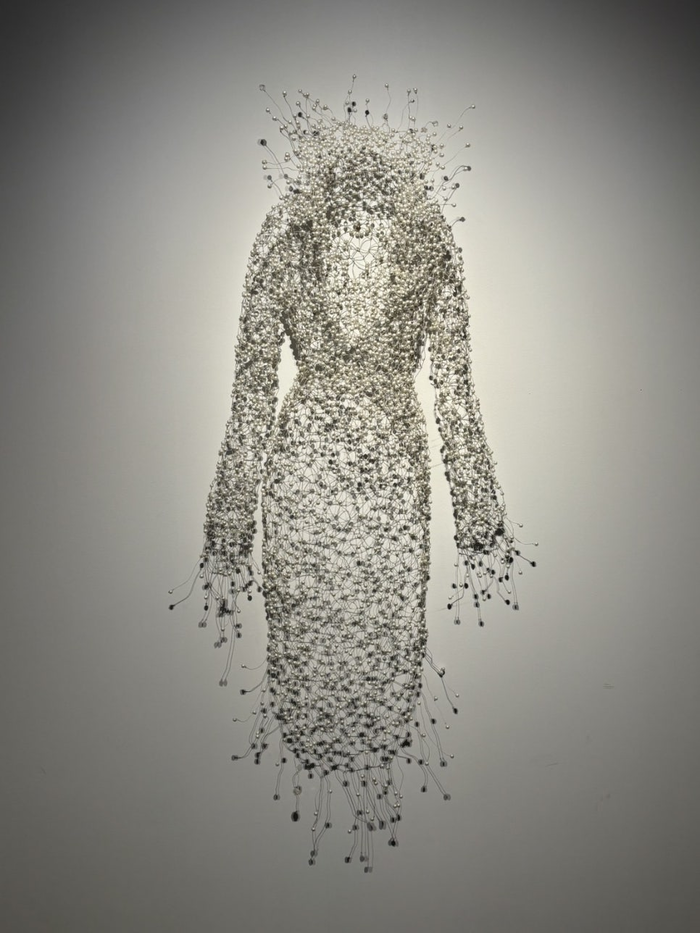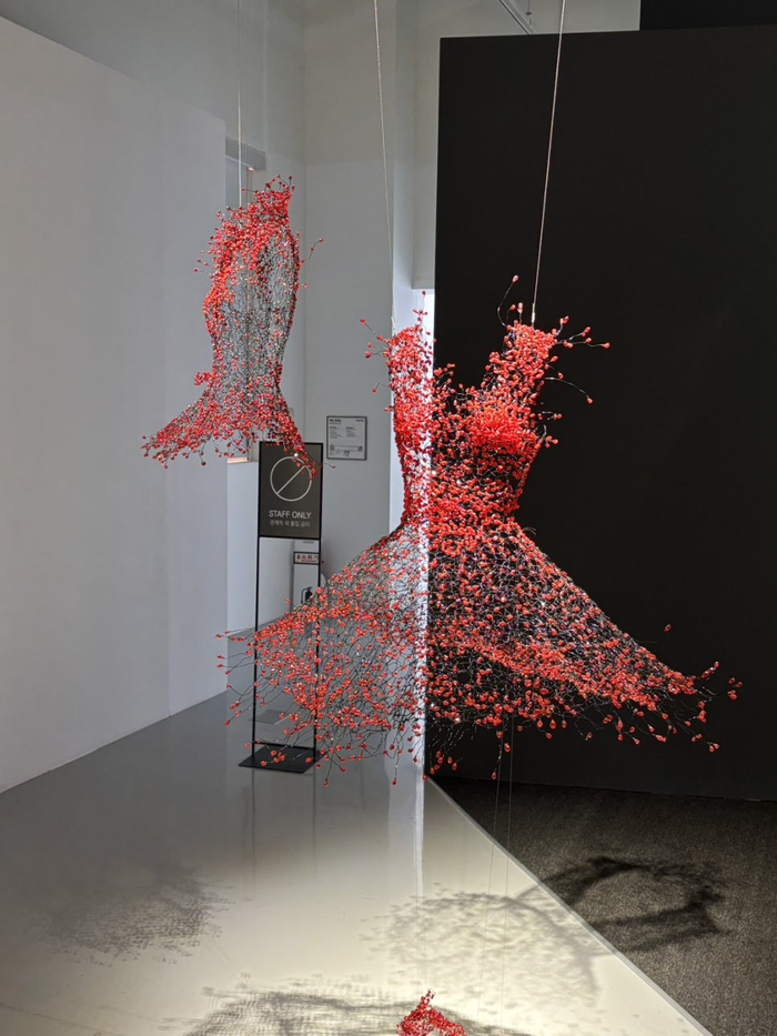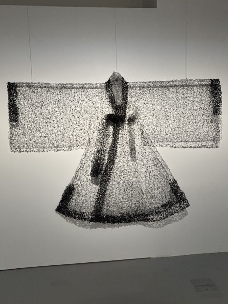 전시장 입구에 배치된 ‘백매’ / 사진= 이경동 여행+ 에디터 ​전시장 입구에 배치된 하얀 드레스 ‘백매(白梅)’는 와이어에 투명 비즈를 더해 제작한 작품으로,어두운 공간에 매달린 형태로 연출돼 몽환적인 분위기를 자아낸다.