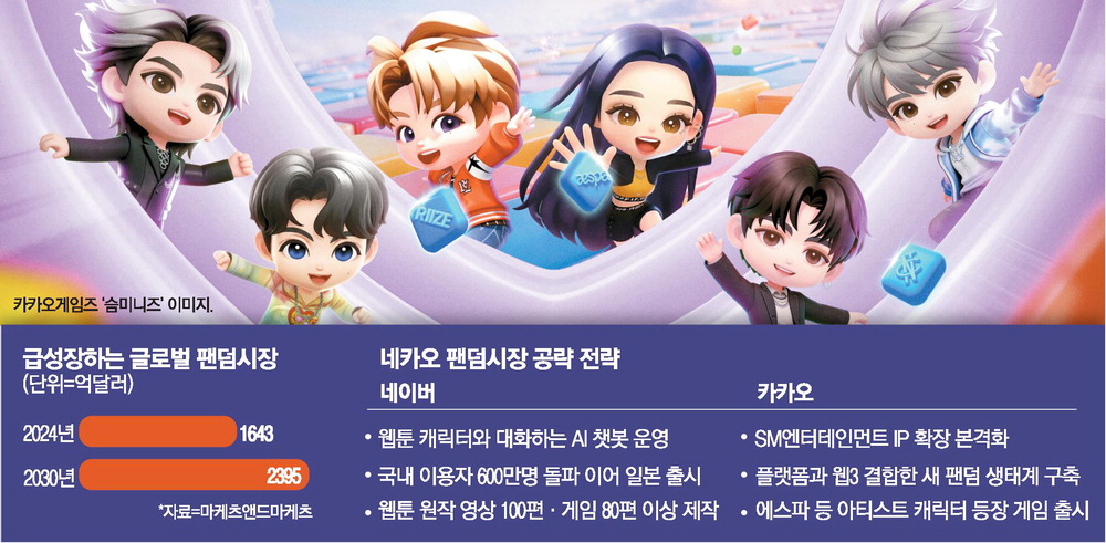 전 세계를 휩쓴 K컬처를 무기로 네이버와 카카오가 올해 나란히 연간 200조원이 넘는 글로벌 팬덤시장 공략에 나섰다. 최애(가장 좋아하는 연예인이나 캐릭터)에게 아낌없이 지갑을 여는 1020 팬층을 겨냥해 K팝과 게임(카카오),웹툰(네이버)이라는 핵심 자산 활용에 시동을 건 것이다.