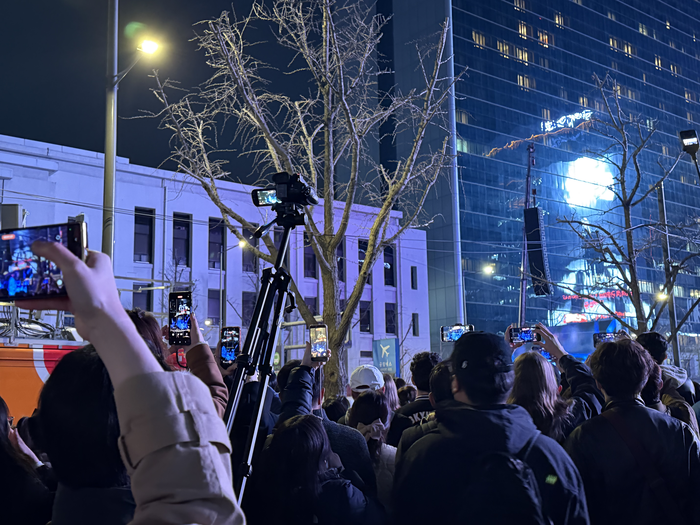 광화문역 뒷편 스크린을 찍는 방문객들 / 사진= 문서연 여행+ 기자 이날 인파가 가장 많이 몰린 곳은 무대 앞이 아니라 광화문역 뒤쪽이었다. 애초에 티켓이 없는 사람들은 아침부터 오지 않는 이상 무대 근처로 가는 것 자체가 불가능했다. 당일 현장을 돌아다니며 여러 구역을 확인했지만 무대는 코빼기도 보지 못했다.