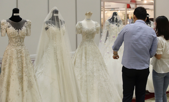 예비 신랑 신부가 웨딩드레스를 둘러보고 있다. 연합뉴스 지난해 고용과 소득이 상대적으로 안정적인 사무직과 전문직을 중심으로 혼인이 급증하면서 3년 연속 전체 혼인 증가세를 견인한 것으로 나타났다.